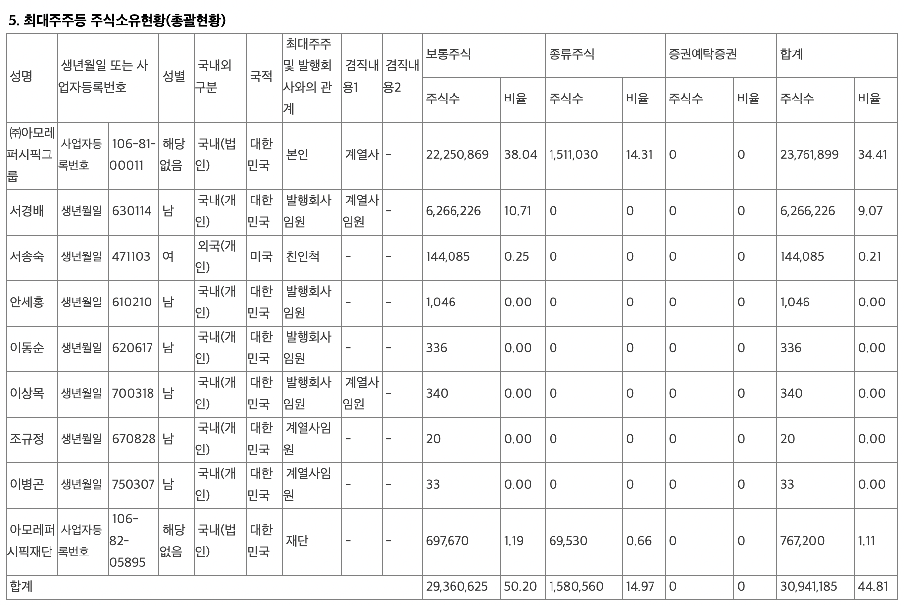 ** 최대주주는 역시 6,266,266주 를 보유하고계신 용산구 이태원동 거주중인 서경배 회장님..