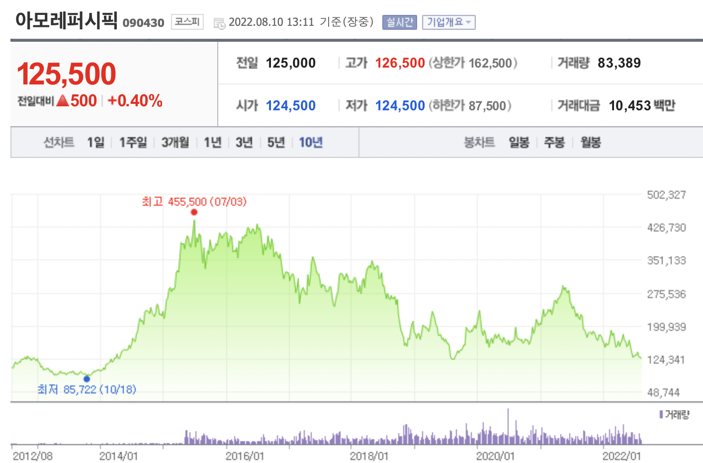 한때 455,00원도 갔던 아모레 퍼시픽이 현재는 12만원 꼴.