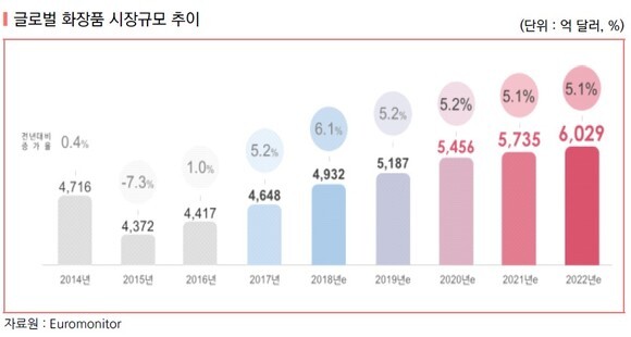 첫번째, 글로벌 화장품 시장은 매년 커가고 있다. 화장품은 돈되는 시장이다.