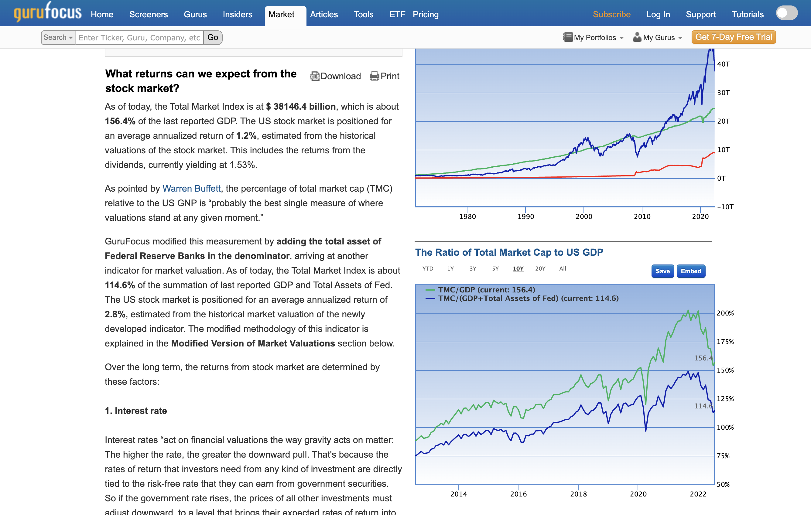 What returns can we expect from the stock market? As of today, the Total Market Index is at $ 38146.4 billion, which is about 156.4% of the last reported GDP. The US stock market is positioned for an average annualized return of 1.2%, estimated from the hi