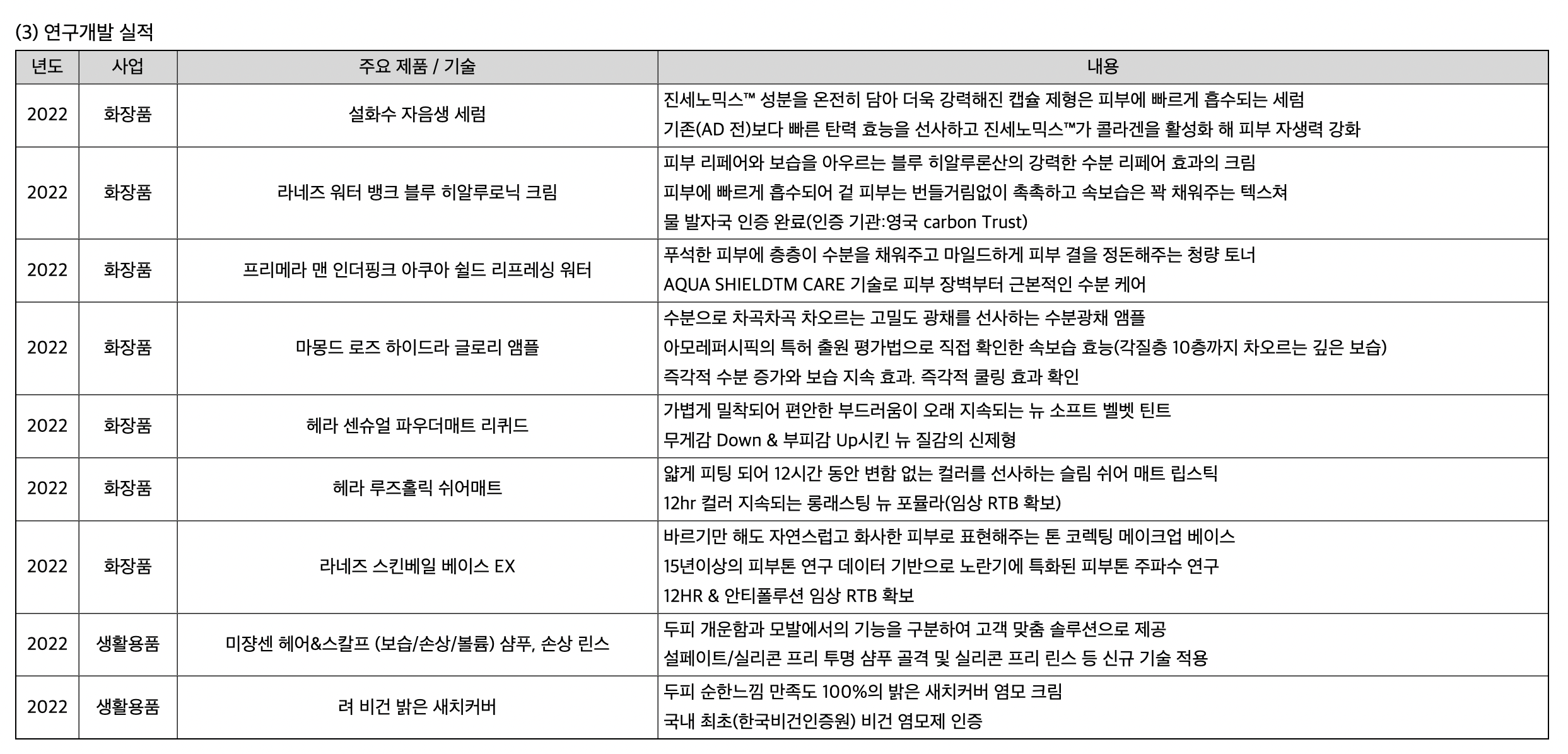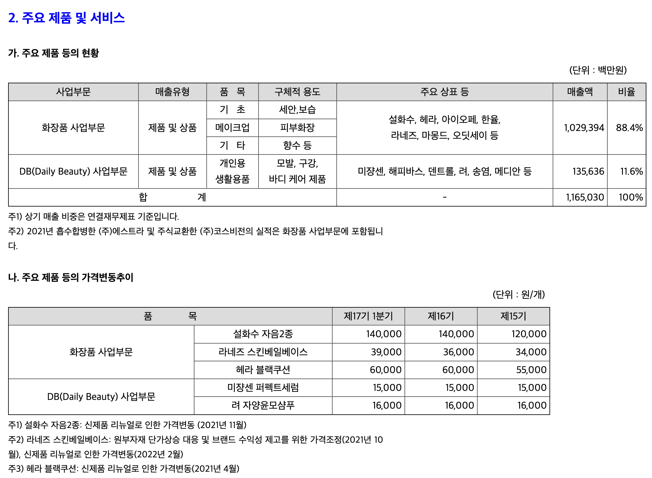 주2) 상기 데이터는 계열사((주)이니스프리, (주)에뛰드, (주)에스쁘아, (주)아모스프로페셔널)의 성과 포함.