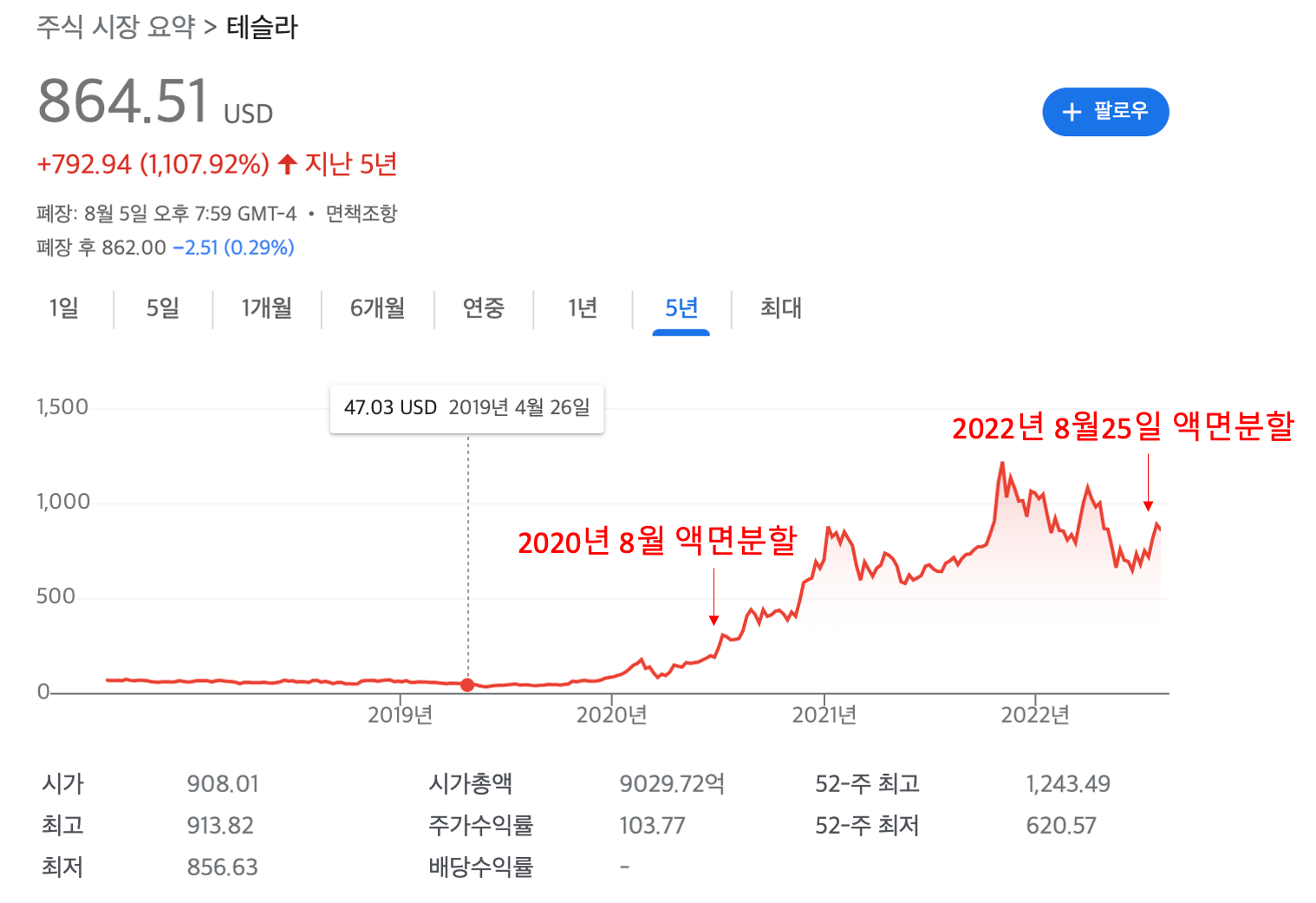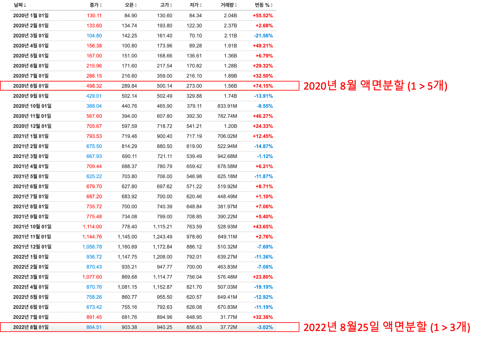 과거 액면분할 지난 2020년 8월! 이후 80%까지 상승함.