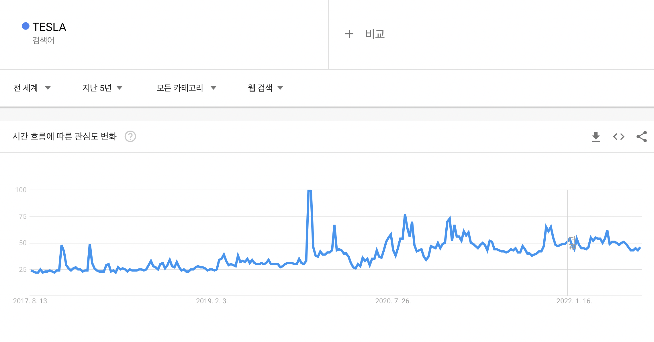 전체 추세로는 검색어가 상승세. 찐소비자들은 테슬라에 관심을 갖고있다!?